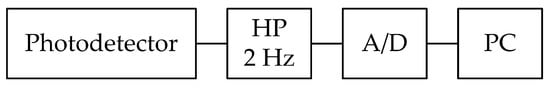 In the presented solution, the evaluation unit consists of several parts: a laser (MCLS1 Thorlabs, wavelength 1550 nm) with a reference power of 1 mW; a photodetector (Thorlabs PDA10CS-EC, InGaAs 700–1800 nm); an analogue-digital (A/D) converter, used as a measuring card (NI USB 6210 National Instruments, Austin, TX, USA); an analogue first-order high-pass (HP) filter with a corner frequency of 2 Hz; and a computer (PC). The presented solution (sensor and evaluation unit) was based on conventional single-mode G.652 optical fibers. A simplified block diagram of the sensor system’s detection component is shown in Figure 2.