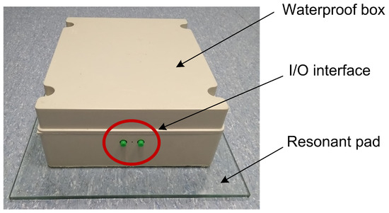 For the final construction of the resonant pad of the sensor, we chose glass (soda-lime glass) as an ideal material to contain the interferometer’s measuring fiber. A series of laboratory measurements were carried out to verify the effect of the thickness and size of the glass (resonant pad) on the transmission of vibrations to the measuring () optical fiber. A thickness of 1 cm and a size of 50 × 50 cm was selected (please see the publication [45]); these values showed a compromise with regard to sensitivity, frequency range, price, and practical installation. A photo of the fiber-optic interferometric sensor prototype is shown in Figure 3. The I/O interface of the sensor consists of the FC/APCconnectors (labeled red in Figure 3).