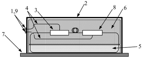 For the final construction of the damped part of the sensor, polystyrene foam was chosen because of its low thermal conductivity and ability to dampen higher frequencies. The tested minimum value for sufficient dampening of vibration transmission to the optical fiber was determined as 5 cm, mainly because of the sensitivity and frequency range of the interferometric sensor. Further, we tested the methodologies of installing measurement and reference fibers, waterproof boxes, splitters, fastening and housing materials, and optical fiber protections; please see our publications [43,44,45,46,47].
