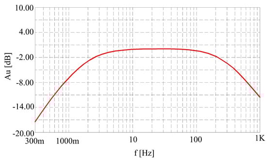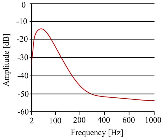 As reference equipment, a Gaia 2T apparatus with ViGeo2 seismic sensors was used (made by Vistec, Praha). The Gaia 2T equipment is a three-channel seismic station with a dynamic range of 138 dBp-ps and the option for triggered or continuous digital data recording. Synchronization of time was provided with a GPS module, and data were recorded on compact flash drives. ViGeo2 is a compact, active, short-period, three-component, high-speed seismometer for field and stationary applications. The seismometer includes three mechanical vibrating systems (sensors) with a frequency of 2 Hz and a frequency range of 2–200 Hz. The frequency range of the sensor is shown in Figure 6; the horizontal axis shows frequency, and the vertical shows amplitude.