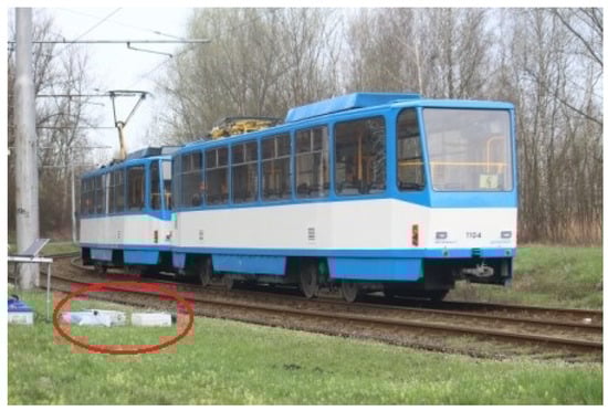 The range of vehicle speeds measured was 15–65 kph, in accordance with the limits given by rail signs. The total measurement time was performed over ten separate days. Measurements were carried out in two different climatic conditions: winter (temperatures below 0 C) and summer (temperatures above 25 C). Figure 9 shows the measurement methodology. Statistical analysis of the detection success rate was based on a total of 769 measurements, i.e., the number of trams that passed.