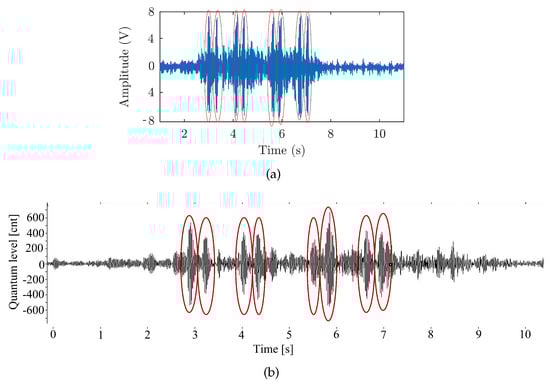 Figure 11a shows an example of a time record of the passing tram measured by the interferometric sensor, while Figure 11b shows a time record of the passing tram measured by the Gaia 2T seismic station. Analysis and evaluation of the measured data identified the individual axles of the passing tram as individual maximums (Figure 11, marked in red). These maximums can be seen in all the recorded measurements and correspond to the recordings obtained by the Gaia 2T seismic equipment. This standard seismic station can be used as a reference for calculating rolling stock axles, as demonstrated in [51]. The voltage amplitude (V) corresponds to the resulting intensity of optical radiation on the photo detector and is proportionate to the size of the phase change between the light beams and the measuring and reference arms of the interferometric sensor.