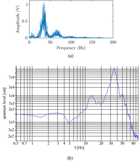 Figure 12a shows the frequency spectrum of the passing tram measured by the interferometric sensor, while Figure 12b shows an example of the frequency spectrum measured by the seismic station.