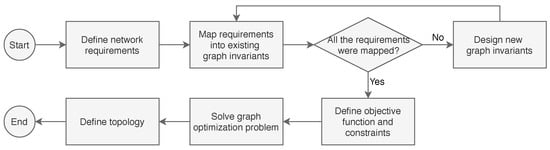Figure 1 presents our proposed method. The first step is to define the network requirements that will guide the topology design (e.g., low latency, resilience, and nodes have up to four communication interfaces). Then, these requirements are mapped into graph invariants that are described in the literature. For instance, average latency can be mapped to average distance, and the maximum number of interfaces can be mapped to maximum node degree. If it is possible to map all the requirements, then the next step is to create an optimization model. Otherwise, it is necessary to design new invariants that can capture the outstanding network requirements. One example is the design of the Wiener impact invariant, described in the previous section, for capturing the resilience requirement.