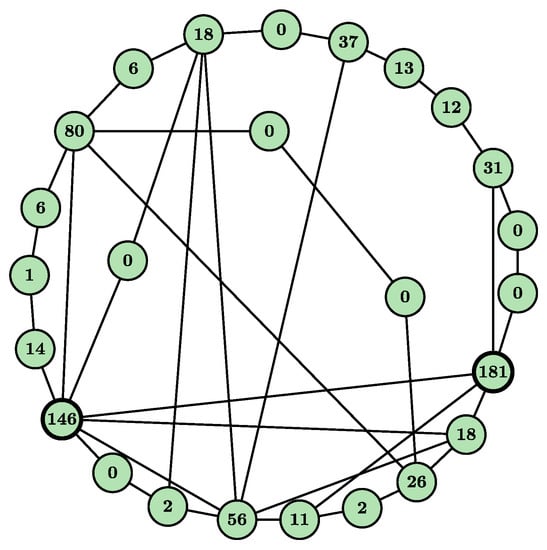 With the goal of minimizing these impacts, an expert could propose the solution shown in Figure 3b [37], which attempts to combine the benefits from ring and star topologies. This solution reduces the latency related invariants (the average distance, from to , and the diameter, from 7 to 2) and the Wiener index by adding 12 edges from each node to a central node. On the other hand, its benefits are still dependent on a single node, which is related to the high values for maximum degree (13) and degree variance (). The maximum and minimum values for Wiener impact (130 and 0, respectively) also demonstrate the significance of removing this central node on the transmission of the other nodes and, thus, show that the solution is not resilient.
