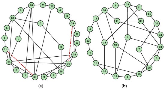 An analysis of Figure 5 shows that the highlighted nodes have high Wiener impact values (181 and 146), which tell us that the impact on the overall network resilience of removing these nodes is high. This diagnosis can drive an expert to connect extra edges in the network to reduce the impact of their disconnection. For example, in the graph of Figure 6a, the addition of only two extra edges (highlighted in red dashed lines) to the original graph of Figure 5 reduces the maximum Wiener impact from 181 to 69. This example shows how the analysis of node invariants can be used as an incremental and informed method for increasing network resilience in an existing network that does not support disruptive changes.