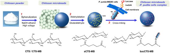 Pseudomonas putida is a well-known non-pathogenic and robust bacterium, with a wealth of oxidoreductases and a versatile metabolism capable of utilizing a wide range of inorganic and organic compounds [27,28]. Moreover, this bacterium exhibits a high tolerance towards harsh environmental conditions and can live in various environmental niches [28], rendering it a valuable host for treating wastewater pollutants. On the other hand, the ease of preparing various CTS matrices by cross-linking modifications has been established due to its good hydrophilicity, mechanical stability and degree of rigidity [29,30]. The immobilization or embedding of various dye-degrading enzymes or cells with dye-degrading or dye-adsorptive capability on CTS leads to increased decolorization efficiency through the increased pores on the surface of CTS beads [31] or immobilized enzymes/cells [30]. To further improve the performance of our laccase-based cell surface display system in terms of decolorization efficiency, stability and applicability for large-scale or continuous processes, in the present study, using a self-configuring device, a facile and applicable CTS-microsome preparation system was self-assembled and used to prepare five CTS microbead (CTS-MB) materials with different microsome sizes from a pulverous CTS substrate. The CTS-MBs were then used to immobilize engineered P. putida MB285 cells with surface-displayed laccase to construct a “CTS-MB/P. putida MB285 cell” biosorbent/biodegrading dual-function system. The effects of temperature, pH and storage time on the laccase activity of the optimal complex were investigated. The interactions between the CTS-MBs and P. putida cells were examined using scanning electron microscopy (SEM) and Fourier transform infrared (FT-IR) spectroscopy. The material was then used to decolorize five synthetic dyes and its decolorization efficiency together with its capability during 10 rounds of continuous decolorization and 6 cycles of re-culturing were investigated.