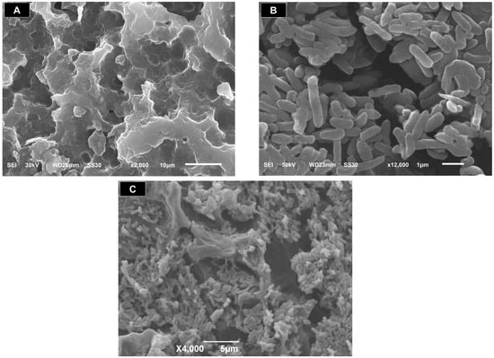 The immobilization profiles of the bacCTS-MB1 complex, aCTS-MB1s and free P. putida MB285 cells were morphologically examined using SEM. The rugged and porous structures of the aCTS-MB1s (Figure 2A) were clearly observed and MB285 cells appeared in a naturally dispersed state (Figure 2B). However, the surface of the bacCTS-MB1 complex was covered by a large number of cells that formed clusters of cell aggregates (Figure 2C). These results indicated that during the formation of “CTS-MB/P. putida cells” as an integral composite, the surface-grafted aldehyde groups and porous and ion-charged surfaces of CTS-MB1 caused the immobilization of P. putida cells, which constitute an associative biomass.