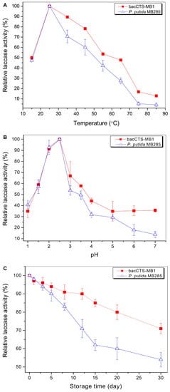 The effects of different temperatures on the whole-complex laccase activity of the bacCTS-MB1s and the whole-cell laccase activity of P. putida MB285 cells were comparatively examined at a range of 15 °C to 85 °C. As shown in Figure 4A, both the bacCTS-MB1s and MB285 cells exhibited parallel variation profiles along with increasing temperature. From 15 °C to 25 °C, the activity of the bacCTS-MB1s and MB285 cells increased rapidly, with maximum activity observed at 25 °C; however, their activity declined sharply at temperatures above 30 °C. Nevertheless, for the bacCTS-MB1 complex, a greater degree of thermostability was evident, as this enzyme lost only 46.4% of its activity at 55 °C, 52.3% at 65 °C and 83.2% at 75 °C, whereas the MB285 cells lost 57.8% of their enzyme activity at 55 °C, 72.6% at 65 °C and 94.8% at 75 °C. Therefore, the bacCTS-MB1 complex exhibited improved thermostability towards higher temperatures.