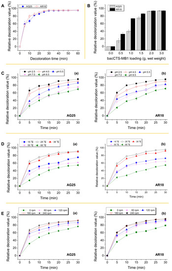 Effect of reaction time (A), bacCTS-MB1 loading (B), pH value (C), temperature (D) and shaking speed (E) on AG25 and AR18 decolorization by the IBCC-B1s. Each reaction included 2 g (unless otherwise specified) of the bacCTS-MB1s (wet weight) and a final concentration of 1 g L−1 of the dye substrate.
