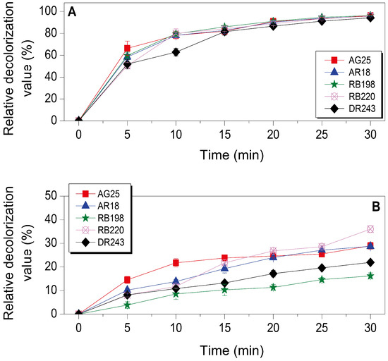 The decolorization capacity of the bacCTS-MB1s on five industrial dyes was determined under optimized shake-flask incubation conditions. Figure 6 shows that the bacCTS-MB1 complex exhibited remarkable dye decolorization, with a maximum relative decolorization value of 96.2% for AG25, 95.6% for AR18, 96.3% for RB198, 95.7% for RB220 and 94.3% for DR243 in 30 min (Figure 6A); conversely, the cell-free CTS-MBs exhibited limited decolorization capacity with 29.0%, 28.7%, 16.2%, 36.0% and 21.9% decolorization values, respectively (Figure 6B). These results indicated that the immobilized P. putida MB285 cells contributed to the decolorization of dyes and the CTS-MB matrix subsidiarity increased the total decolorization capacity via its biosorption activity.