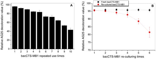 AG25 decolorization capacity of the bacCTS-MB1s during continuously repeated reactions (A) and during continuous decolorization and re-culturing cycles (B). In (B), equivalent freshly prepared bacCTS-MB1s were used as a control for each decolorization reaction cycle.