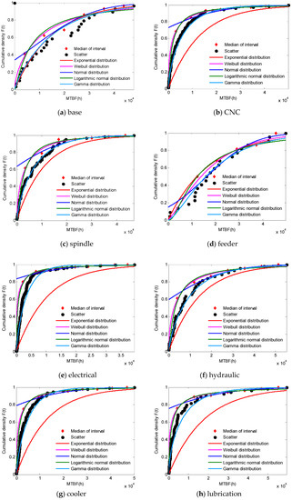 Cumulative distribution curve of each subsystem. CNC—computer numerical control; MTBF—mean time between failures. (a) base; (b) CNC; (c) spindle; (d) feeder; (e) electrical; (f) hydraulic; (g) cooler; (h) lubrication; (i) header; (j) gauge.