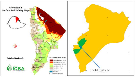Saline soils are now becoming a growing threat to sustainable crop production in the irrigated lands of the semi-arid areas of the world [,]. Currently, over 1000 million ha (Mha) are inflicted with the different levels of salinity problems [], and an additional 0.25–0.5 Mha of agricultural land is lost annually []. The salinity development is mainly caused by the presence of soluble salts in the water used for irrigation, hot and dry weather conditions, and excessive use of poor quality groundwater for irrigation [,]. Salinity problems are wide-spread in the Asian and African regions. In Ethiopia, approximately 11 Mha of land (i.e., 9% of the country’s total landmass and 13% of the irrigated area) is exposed to salinity, of which 8 Mha have combined salinity and sodicity problems whereas the remaining 3 Mha are only sodic in nature [,].