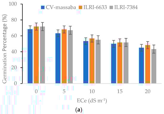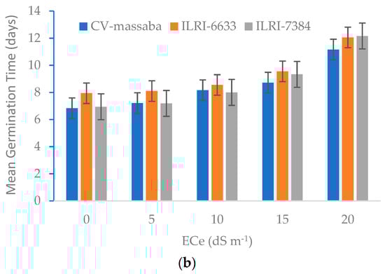 The germination of all three genotypes was delayed with the increasing salinity, i.e., from eight days in control (0 dS m−1) to more than 12 days for higher salinity (20 dS m−1) (Figure 2b). The local genotype CV-massaba germinated faster than the other two genotypes under all salinity levels. This shows that CV-massaba is more tolerant to salinity as far as germination is concerned. On average, the delay in MGT was 4, 13.3, 21.7, and 39.1% at 5, 10, 15, and 20 dS m−1, respectively. The average MGT for all genotypes was 7.2 days in control, with ILRI-6633 being the maximum (7.9 days) and CV-massaba the minimum (6.8 days). At the highest salinity (20 dS m−1), the average MGT for ILRI-7384 was 12.2 days, followed by 12.1 days for ILRI-6633 and 11.2 days for CV-massaba. This shows that although CV-massaba germinated faster, its germination percentage was lower than the other two genotypes. In conclusion, the GP and MGT of all genotypes was negatively influenced by increasing salt stress in the soil. These results agree with the findings of Horst et al. (1989) [] for perennial ryegrass and Iqbal et al. (2006) [] for the teff grass.