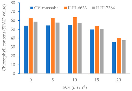 Figure 3 shows the chlorophyll content (SPAD value) of three Chloris gayana genotypes. The SPAD values were found to be consistent up to a salinity level of 10 dSbm−1. However, a significant reduction in SPAD values at salinity levels of 15 dSbm−1 and 20 dSbm−1 was observed. For all salinity levels, highest SPAD values were found in ILRI-6633 followed by ILRI-7384 and CV-massaba. The highest SPAD value (63.6) was recorded in ILRI-6633 at moderate salinity level (10 dSbm−1). However, for 20 dSbm−1, SPAD values decreased significantly for all three genotypes except for ILRI-6633. Similar trends of chlorophyll content reductions with the increasing salinity have also been observed for different crops [,].