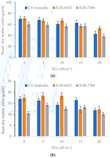 The root dry matter ranged between 10.4–17.4 g/pot at 0 dS m−1, 14.2–18.4 g/pot at 5 dS m−1, 12.5–18.3 g/pot at 10 dS m−1, 12.2–16.4 g/pot at 15 dS m−1, and 10.0–12.2 g/pot at 20 dS m−1 (Figure 4b). For all salinity levels, the highest root dry matter was achieved for ILRI-6633 followed by CV-massaba. The maximum root dry matter for ILRI-6633 and CV-massaba was obtained at low to medium salinity levels (5–10 dS m−1). This suggests that the performance of ILRI-6633 with regard to root dry matter was superior to the other two genotypes. The average reduction in root dry matter ranged from 11.3–16.3 g/pot with an increase in salinity from 5–20 dS m−1. The declining trends in the root dry matter with increasing salinity levels can be ascribed by the fact that in saline soils, plants spend more energy to get water and nutrients from the soil. This situation negatively affects the yield and the quality of the plant [,,,,].