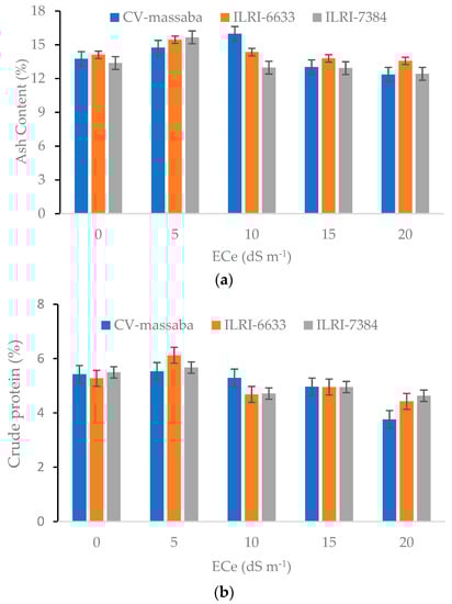 Forage grasses are considered to be the most remunerative form of animal feed in semi-arid regions. The nourishing value of forages mainly depends on their nutritional composition such as crude protein (CP) and fiber and ash contents []. Crude protein is an important element of the animal diet that enhances their milk-producing capacity and maintains meat quality []. Both CP and ash contents of three Chloris gayana genotypes exhibited a decreasing trend with increasing soil salinity. The highest CP (6.1%) and ash (15.5%) contents were obtained in ILRI-6633 and ILRI-7384 genotypes at low salinity level (5 dS m−1), whereas CV-massaba reported the lowest crude protein (3.8%) and ash content (12.4) at the same salinity level (Figure 5). However, CV-massaba genotype produced a higher CP content at salinity levels of 10–15 dS m−1. Generally, low dry matter-producing genotypes are known to have higher CP content whereas high dry matter producing accessions are low in nutrition at low salinity levels [,]. All three genotypes produced high CP and ash content at low to medium salinity (0–10 dS m−1) levels while a falling trend was observed at higher salinity levels (15–20 dS m−1). This shows that these varieties are more suitable for low to moderate salinity conditions.