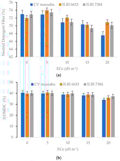 Neutral detergent fiber (NDF) mainly consists of hemicellulose, cellulose, and lignin. From the feeding point of view, lower NDF values are desirable for fodder as well as grains [,]. The NDF values for all three genotypes showed an increasing trend with the growing salt stress. Differences in NDF among the Chloris gayana genotypes show a similar trend as of CP. ILRI-6633 reported the highest NDF (70.9–73.9%) value whereas the lowest NDF values (67.5–72.9%) were observed in CV-massaba for all salinity levels (Figure 6). The average Invitro dry matter digestibility content (IvDMDC) was 42.9% for control, 41% at 5 dS m−1, 41.6% at 10 dS m−1, 40.2% at 15 dS m−1, and 36.1% at 20 dS m−1 (Figure 6). The highest IvDMDC was obtained in ILRI-6633 at control while the lowest was observed in CV-massaba at 20 dS m−1.