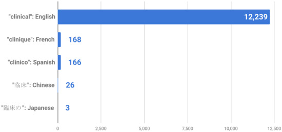 This study refers to clinical software as software that is implemented in healthcare to help doctors improve patient care. Software that is developed for biological research, such as genome sequencing [20] and cell screening [21], were excluded. Therefore, “(clinical OR medical) OR (patient OR doctor)” was selected as the search term. English terms were used given that the majority of repositories have their names and descriptions in English. Figure 1 shows the numbers of repositories returned using the search term “clinical” in different languages. Second, the search term covered the main entities in the clinical domain.