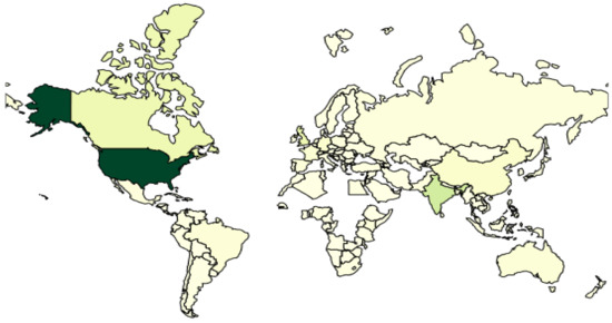 Table 3 shows the top 10 countries that contribute most to the open source community based on the number of GitHub repositories. Figure 2 is the geographic visualization of a country’s repositories (accessible at Reference [38]). As shown in the figure, the U.S. is unsurprisingly the biggest player, taking up to 38.8% of the total GitHub repositories. Among developing countries, India contributes the most, with around 10%.