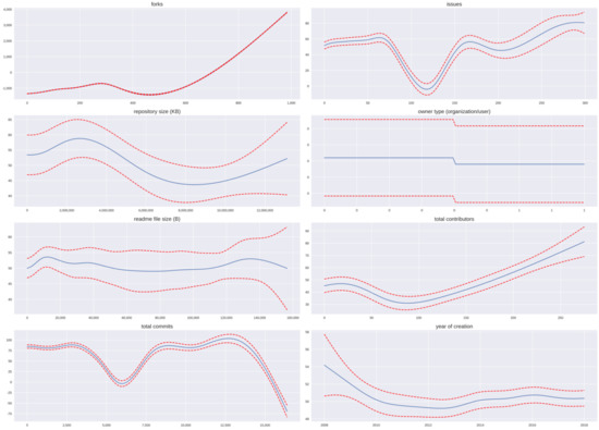 As an extension of generalized linear models (GLMs), a GAM is an additive modeling technique that captures the impact of the predictive variables through smooth functions [27]. It is best known for its interpretability, which can determine the contribution of each independent variable to the prediction. Therefore, we chose a GAM to help us identify the relationships between several repository features and its popularity (the number of stars). To begin with, we built a linear regression model that predicted the number of stars of a repository based on a number of predictors: Forks, the number of issues, the repository size, owner type, the size of README files, the number of contributors, the total number of commits, and creation year. Then, partial dependency plots were produced to explicitly show the relationships between the predictors and the number of stars on GitHub repositories. We chose pyGAM, a Python package for GAM, as the package for our implementation [28].