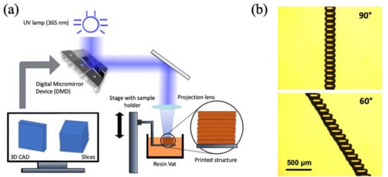 - Sun, C.; Fang, N.; Wu, D.; Zhang, X. Projection micro-stereolithography using digital micro-mirror dynamic mask. Sens. Actuators A: Phys. 2005, 121, 113–120. [Google Scholar] [CrossRef]