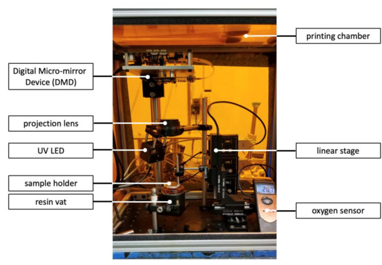 The AM system used in this work is a custom-built PμSL system capable of manufacturing micro-scale features. It consists of a linear stage (Thorlabs), on which the sample holder is attached. A projection lens (Thorlabs) is used to achieve a lateral resolution of 12 μm. A digital micromirror device (DMD) (Texas Instruments, Dallas, TX, USA) is used for generating projection patterns according to cross-sectional digital images of a 3D model. UV LED (365 nm, Hamamatsu, Hamamatsu City, Japan) is used as a UV illumination source. The UV light reflected from the DMD is projected on the surface of the resin inside the vat. Once a layer is formed, the sample holder is lowered by the layer thickness, and the next image is projected to cure a new layer on top of the previous one. This process repeats until all layers are completed. The actual system used in this study is shown in Figure 2. The setup is kept in a printing chamber where environmental factors such as external light and oxygen concentration are controlled.