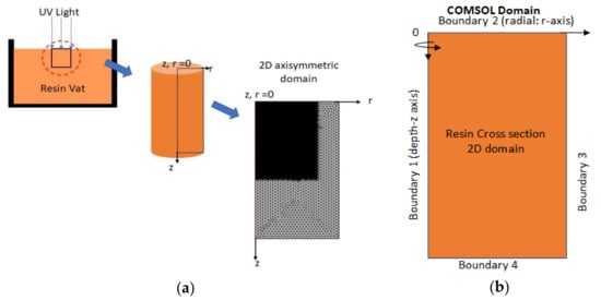 The photopolymerization model is solved by commercial finite element analysis (FEA) software, COMSOL Multiphysics. We created a 2D axisymmetric domain representing a cross-section of cylindrical volume of resin in the vat of the PμSL system, as shown in Figure 3a.
