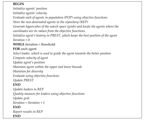 First, the algorithm initializes agents’ position and velocity. Population (POP) is the memory where all agents’ information in certain iteration is stored. For the initial set, all agents are evaluated based on its randomly distributed positions. Repository (REP) is the external repository where the non-dominated agents in POP are stored. The dominance of each agent is determined by the objective functions. The MOPSO algorithm generates grids that cover all the search space and locate all agents in the grids where the coordinates are its objection function. This controls the density of local agents by determining the local optimizer (leader) that leads neighboring agents. Personal (agent) best position, called PBEST, in the search space keeps the best local optimizer that each agent experiences when it travels through the search space.