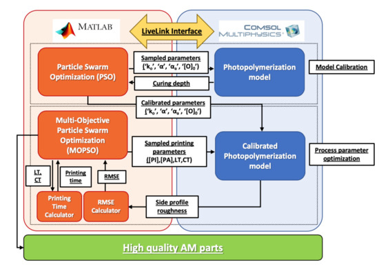 Second, MOPSO samples printing parameters in the parameter search space and passes it to the updated model in COMSOL Multiphysics to obtain surface profile of AM part of given inputs. The surface profile is extracted from photopolymerization simulation and returned to MATLAB. The custom-built MATLAB script calculates root mean squared error (RMSE) value of the given surface profile and uses it as an objective function in the optimization process. The method to calculate RMS for a given surface profile is explained in detail in Appendix D. Another objective function is printing time, which can be calculated by using a custom-built MATLAB script. The detailed method for obtaining printing time is in Section 3.3. This loop continues until it reaches the iteration limit.
