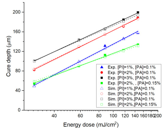 In order to validate our computational model, we first experimentally obtained working curves of resins having different PI and PA concentrations. The details regarding sample preparation and post-processing procedure are described in Appendix A. PSO was performed on several simulation constants of ‘ko’, ‘α’, ‘αa’, ‘[O]0’, and ‘C’ to calibrate the computational model. The values of these parameters are reported at a varied range in literature as listed in Table 3. Using RMSE as an objective function, optimization algorithm POS was performed. Table 3 also lists calibrated parameter values after performing PSO. With the calibrated parameters, we performed numerical simulations to obtain working curves for the same resins used in the experiment. Working curves from simulation and experiment are shown in Figure 6 and they show a good agreement. Based on this result, we confirm the validity of our photopolymerization computational model.