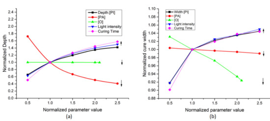 Similar analysis was performed to study the effect of the parameters on curing width. As shown in Figure 7b, it is interesting that environmental oxygen concentration has the highest effect on curing width. As environmental oxygen concentration increases, oxygen inhibition becomes more prominent at the surface of the resin, which results in decrease in curing width. As expected, when (PI), light intensity, and exposure time increase, curing width increases due to increased light energy or reactivity of resin. In contrast to curing depth case, (PA) has least effect on curing width because its role is primarily to control the penetration of light in depth direction.