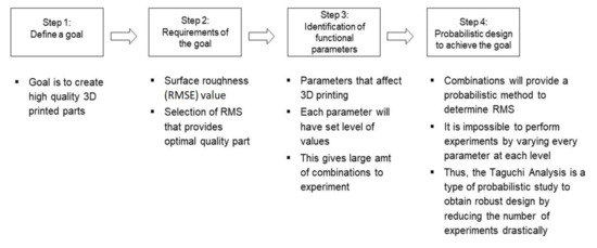 In PμSL process, a 3D part is built in a layer-by-layer fashion. Since each layer has its own characteristic side profile as a result of photopolymerization reaction, when they are stacked together repeatedly, a distinctive surface roughness arises. This is called the staircase effect. We performed a systematic analysis to study effect of PμSL process parameters on the surface roughness of a 3D printed structure. Since there are many parameters involved, we employed design of experiment (DOE) method proposed by Taguchi to reduce the number of experiments to be performed. This method is known as Taguchi method of orthogonal arrays (OA) [37,38,39]. Figure 8 shows the steps involved in DOE for this study.
