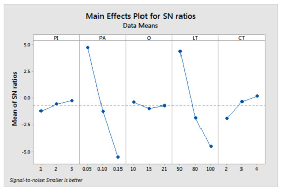 Based on this result, main effects plots for SN ratios in Figure 9 were generated. Also, a response table (Table 6) was generated, from which the parameters that have the largest effect on the response can be identified. In Figure 9, the average SN ratio of the response is presented by the dotted line. Since the goal here is to find values for each parameter that maximize the SN ratio, the optimal values for each parameter can be determined to achieve the minimum surface roughness. The rank represents which factor affects surface roughness the most. Rank is based on the delta value, which is the difference between the highest and the lowest average SN ratio value for each factor. From the response table, the parameter that affects surface roughness the most is PA concentration, and oxygen concentration has the least impact on surface roughness.