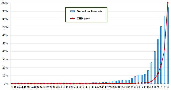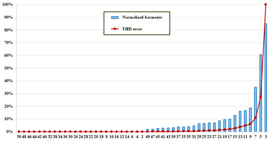 Figure 5 shows the amplitude of the current harmonics normalized with respect to the fundamental one, in case of a CFL with 212V (rms) at its terminals. The normalized harmonic amplitudes, in blue, are sorted in ascending order and the abscissa reports the related harmonic. The figure also reports, in red, the THD error in percentage when some current harmonics are neglected, assuming as THD reference, THDI,TOT, the one computed considering the harmonics until the 50th. More specifically, for a given harmonic, n, the THD error, , is obtained when a set of m harmonics are neglected. Harmonic n and those on its left in the figure belong to this set. The current THD reference is [74]: