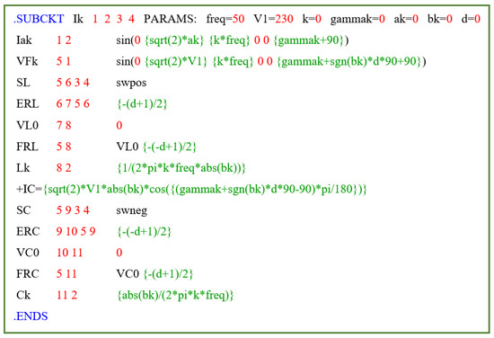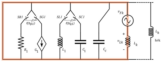 The components in the subcircuits called “Active”, “Reactive”, and “kth harmonic” emulate the behaviour of, respectively, , , and in Equation (14). According the circuit model in the figure and the equations in (14), the following equations are valid: