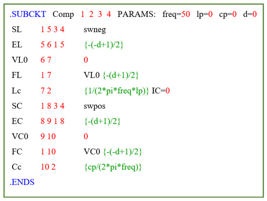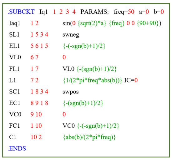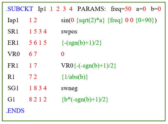 In [75] and [76] have been presented, respectively, a circuit model (called “fundamental current circuit”, Figure 9) of the active and reactive current as well as the related PSpice model. The model of the fundamental current has been slightly modified in this work and for sake of completeness the main considerations and relations are reported in the following.