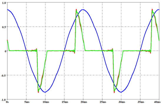 Therefore, the term iP1(t) affects only the active power, then in the following it is called “active current”. The term iQ1(t), affects only the reactive power, then in the following it is called “reactive current”. Finally, as expected, in all performed tests for all the lamps, the phase shift of the fundamental frequency current drawn was always: (with respect to the voltage on the mains), which implies a positive value of in Equation (12).