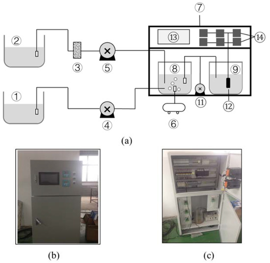 To apply the developed method for in situ monitoring the ROUR in WWTPs, an online early-warning system was assembled, consisted of a wastewater tank, a sludge tank, a filter, an aerator, a water pump, a sludge pump, a batch reactor for DO measurement, a DO probe, and a programmable logic controller (PLC), as illustrated in Figure 2a. The wastewater influent was continuously pumped into the wastewater tank after filtering and the activated sludge samples were directly pumped into the sludge tank. They were then mixed together in the batch reactor. The batch reactor was kept stirring (200 rpm), completed aerated (10 min), DO-monitoring (10 min) and finally discarded through the effluent tube. The whole online early-warning system was built up on a mobile platform (650 mm × 400 mm × 1200 mm, length × width × height) manufactured with galvanized steel plain sheets (Figure 2b,c). The flow rate of wastewater and the activated sludge was 350 and 50 mL/min, respectively. The aeration was achieved by a microporous aerator and the DO after aeration maintained above 6 mg/L. The PLC software was programmed for either automatically or manually controlling operational parameters of the early-warning system, including a main menu (menu selection), a trend menu (real-time illustration of OUR change), a sampling menu (sample injection and discard control), a device menu (device check), a warning menu (alarm for low ROUR and system fault), and a setting menu (parameter setting).