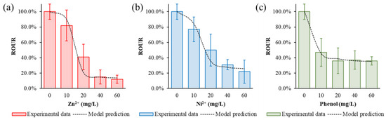 MLSS had buffering capacities for the inhibitory effects of toxic substances, as the ROUR increased with the MLSS contents for both PTEs and phenol (Figure 4). When the MLSS content was 5000 mg/L, the ROUR reached 99.0 ± 5.5% and 79.8 ± 21.5% for Zn2+ and Ni2+, respectively. Phenol had the same trend and the ROUR increased to 66.6 ± 12.7% at 5000 mg/L of MLSS. Accordingly, the ROUR-reciprocal was positively correlated with MLSS-reciprocal, as expressed in Equation (4).