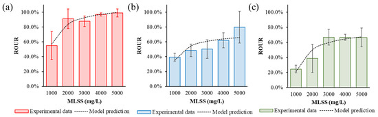 The ROUR in treatments with different mixed liquid suspended solids (MLSS) post exposure to toxic substances. (a) Zn2+, (b) Ni2+, and (c) phenol.