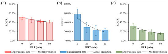 The ROUR in treatments with different hydraulic retention time (HRT) post exposure to toxic substances. (a) Zn2+, (b) Ni2+, and (c) phenol.