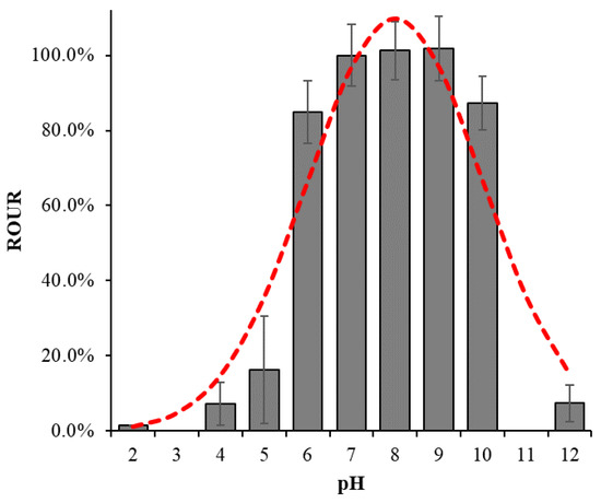 The effects of pH on the ROUR behaved as a bell shape, as illustrated in Figure 6. The ROUR peaked at pH 6–10 and achieved above 80% comparing to that in the absence of toxic substances. It declined dramatically to below 10% under extremely acidic (pH < 4) or alkaline (pH > 10) conditions. The activated sludge was reported to be sensitive to pH, as most bacteria can only survive in a relatively narrow range of pH [72] and the activities of some microorganisms were inhibited under low or high pH conditions [73]. For example, pH from 5.1 to 6.1 markedly depressed the metabolisms of the activated sludge [74]. Additionally, pH control was critical for optimizing the performance of WWTPs [75]. Our results suggested that the ROUR was quite stable within a broad range of pH (6–10), covering most of the operational pH in WWTPs, and was suitable as an indicator for online early-warning system measuring the shock load of industrial wastewater.