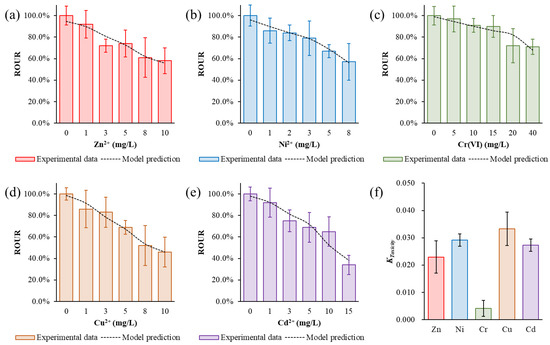 Impacts of potential toxic elements (PTEs) on the ROUR by the online early-warning system. (a) Zn2+, (b) Ni2+, (c) Cr(VI), (d) Cu2+, (e) Cd2+, (f) of different PTEs.