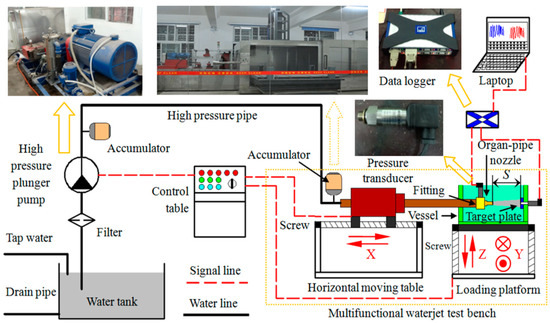 The experiment was performed using a multifunctional waterjet test bench that has been applied in the previous investigations [15,17,18,20,21,22,23,24,25,26,27,28,29,33]. The test bench had a horizontal moving table with X directional motion and a loading platform that had Y and Z directional motions. The tested organ-pipe nozzle was mounted at the end of a hollow-rod fixed on the horizontal moving table, and a small tank filled with water was positioned on the loading platform. A target plate, which had a pressure tap of 1 mm diameter at its center, was fixed on the wall of the tank. The pressure tap was communicated with a dynamic pressure transducer (Model: XPM 10), which was connected with a data logger (Model: MX840B) used to collect the axial pressures of the SRWJ. The maximum and minimum pressures could be directly displayed on the laptop connected to the data logger. Furthermore, the pressure oscillation amplitude was defined as the difference of the two pressures, which is:
