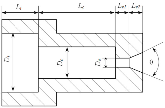 To produce the tested organ-pipe nozzles, all the geometrical parameters shown in Figure 1 should first be acquired From Equation (4), it can be found that Uj should be obtained in order to get the value of Lc/De, because the values of Sd and c are already known as 0.3 and 1450 m/s, respectively. The inlet, chamber, and exit diameters can be determined as 13 mm, 5 mm, and 2 mm, respectively, based on the previous results [13,14]. The process for getting the values of Uj corresponding to the two inlet pressures is shown below.