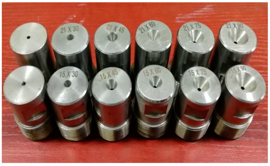 where A1 and A2 are the cross-section areas at the area contraction. A preliminary calculation indicated that the frictional head loss was rather small and could be ignored. Therefore, the chamber lengths could finally be obtained by combining Equations (4), (6), (8), and (9), and were Lc = 21 mm and 15 mm, respectively, corresponding to inlet pressures of Pi = 10 MPa and 20 MPa. Six exit angles were employed in the experiment, which were 0°, 30°, 45°, 60°, 75°, and 90°, respectively. The geometrical parameters of the tested organ-pipe nozzles are shown in Table 3, and the typical profile and pictures of the testing organ-pipe nozzles are displayed in Figure 3 and Figure 4, respectively.