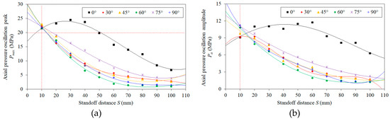 - When the exit angle is 0°, both Pmax and Pa have a convex quadratic relationship with the standoff distance, while they have a concave quadratic relationship with the standoff distance when the exit angle is 30°, 45°, 60°, 75°, and 90°.