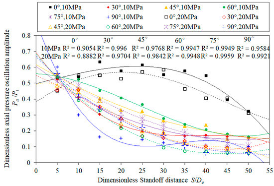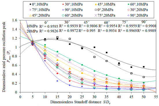 In order to provide further clarification on the pressure characteristics of SRWJs affected by the exit angle of the organ-pipe nozzle under different inlet pressures, a non-dimensional analysis of the Pmax and Pa was performed. Pmax and Pa were non-dimensionalized by Pi; and the standoff distance was non-dimensionalized by De, which has been defined as the characteristic parameter of the organ-pipe nozzle in the previous studies of SRWJs [10,12,20]. The dimensionless Pmax and Pa against the dimensionless S under the two inlet pressures are plotted in Figure 7 and Figure 8, respectively, and the correlation coefficients are also displayed. Moreover, for each exit angle, the differences in the dimensionless peaks and amplitudes under the two inlet pressures were calculated and plotted in Figure 9 and Figure 10, respectively.